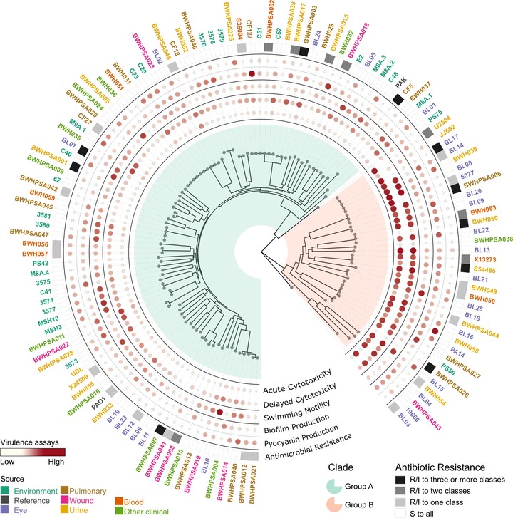 Pseudomonas aeruginosa is a clinically significant, opportunistic pathogen adept at thriving in both host-associated and environmental settings. We sought to define the extent to which P. aeruginosa isolates specialize across niches using a comprehensive study of whole-genome sequencing with paired phenotypic characterization of 125 P. aeruginosa isolates from diverse clinical and environmental sites. We evaluated virulence-associated traits, including motility, cytotoxicity, biofilm formation, pyocyanin production, and antimicrobial resistance to eight antibiotics. Our results show that genomic diversity does not correlate with isolation source or most virulence phenotypes. Instead, we find that, in agreement with prior studies, the two major P. aeruginosa clades (groups A and B) clearly segregate by cytotoxicity, with group B strains showing significantly higher cytotoxicity than group A. Sequence analysis revealed previously uncharacterized alleles of genes encoding type III secretion effector proteins. We observed high variability among strains and isolation sources in the four assayed virulence phenotypes. Antimicrobial resistance was exclusively observed in clinical isolates, whereas it was absent in environmental isolates, reflecting antibiotic exposure-driven selection. Bacterial genome-wide association studies (GWAS) revealed an association between cytotoxicity and exoU presence, and we identified a novel exoU allelic variant with decreased cytotoxicity, demonstrating that functional diversity of well-characterized virulence factors may influence pathogenic outcomes. Overall, our analysis supports the hypothesis that the ability of P. aeruginosa to thrive across diverse niches is driven not by niche-specific accessory genes but by its core genome.